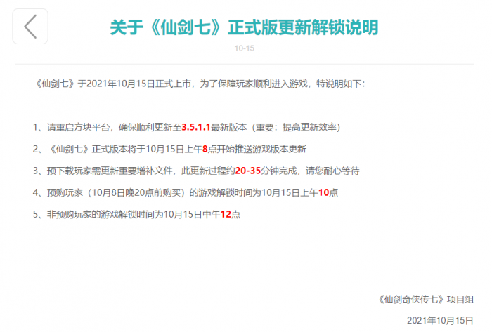 2、《仙剑七》正式版本将于10月15日上午8点开始推送游戏版本更新