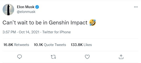 2021年初,《原神》发布了一则“原来你也玩原神”的MV,随后包括字节跳动创始人张一鸣、索尼总裁吉田修平等行业大佬都被曝出是《原神》玩家,包括此次的埃隆·马斯克等,“原来你也玩原神!”成为了一句网络热梗。