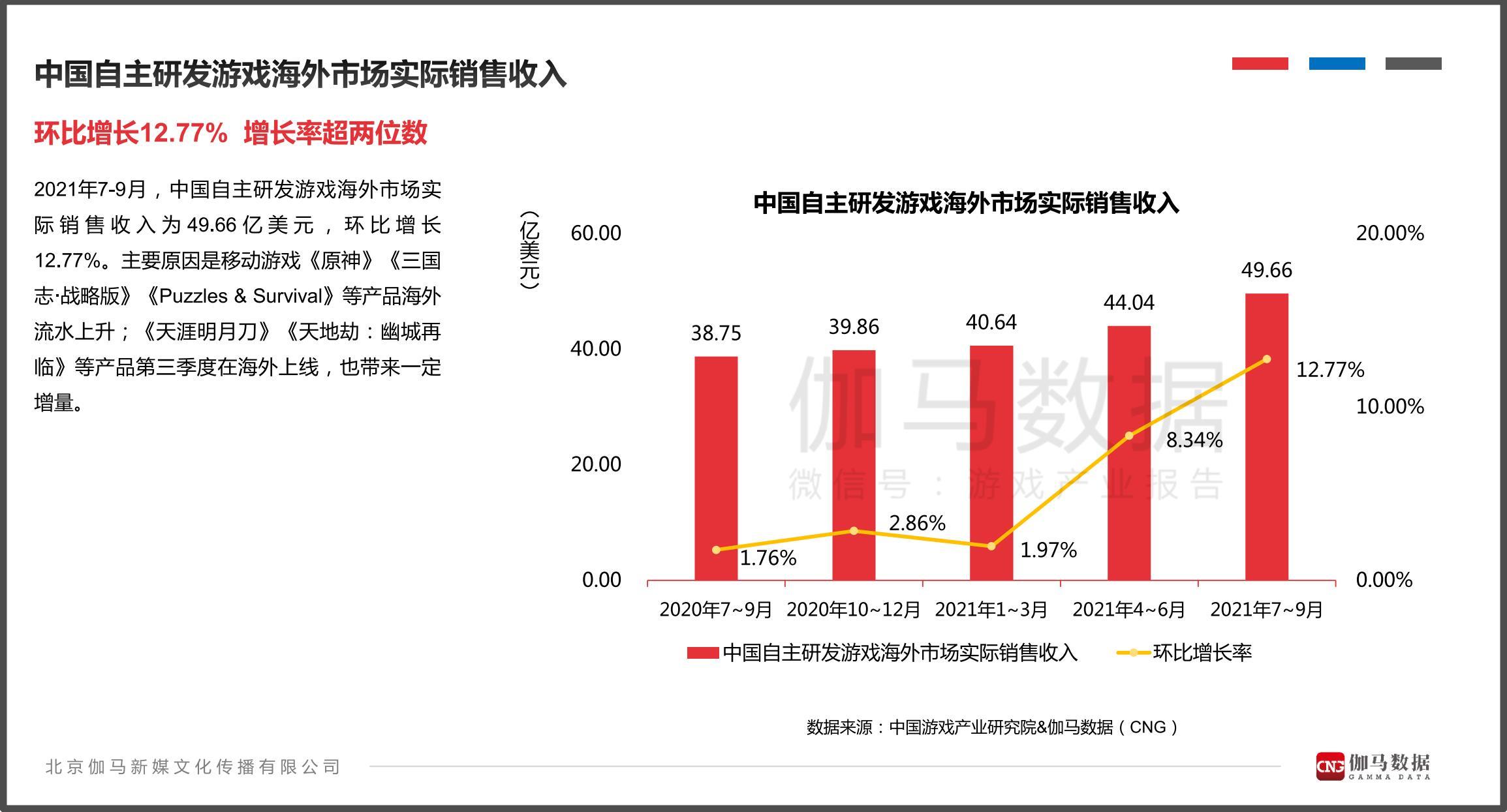值得关注的是,中国游戏在海外持续表现亮眼,游戏产业研究机构伽马数据在10月12日发布的《2021年7-9月移动游戏报告》显示,2021年7-9月,中国自主研发游戏海外市场实际销售收入为49.66亿美元,环比增长12.77%。
