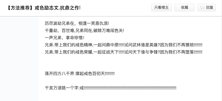 继续看戒色吧的时候,一个帖子帮我回答了这个问题。我开始意识到,戒色吧能吸引这么多人,也许有更深的原因。