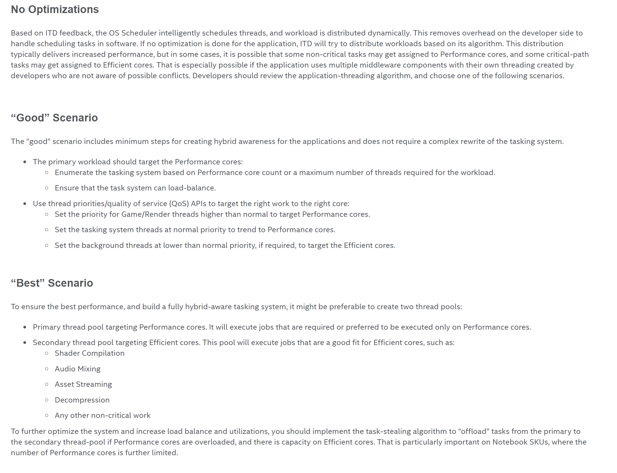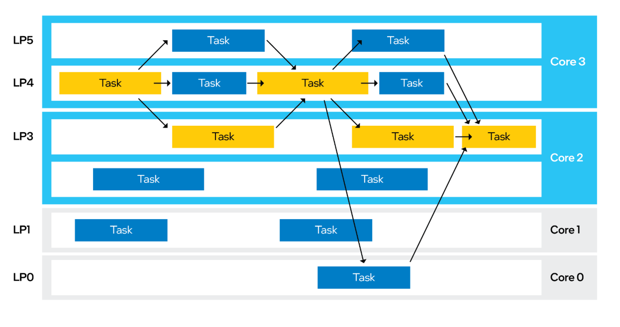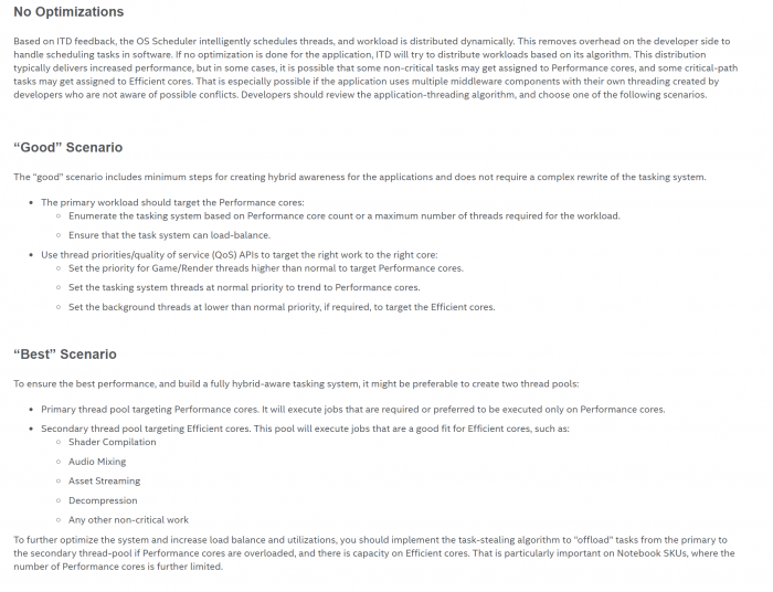 软件本身或者说开发者完全不考虑大小核分配问题,完全由Windows系统调度器基于Intel ITD(线程调度器)的反馈和算法,智能分配线程,动态分配负载。