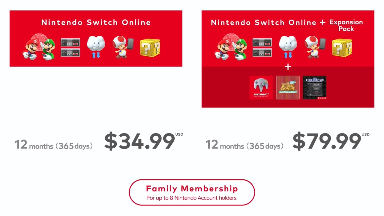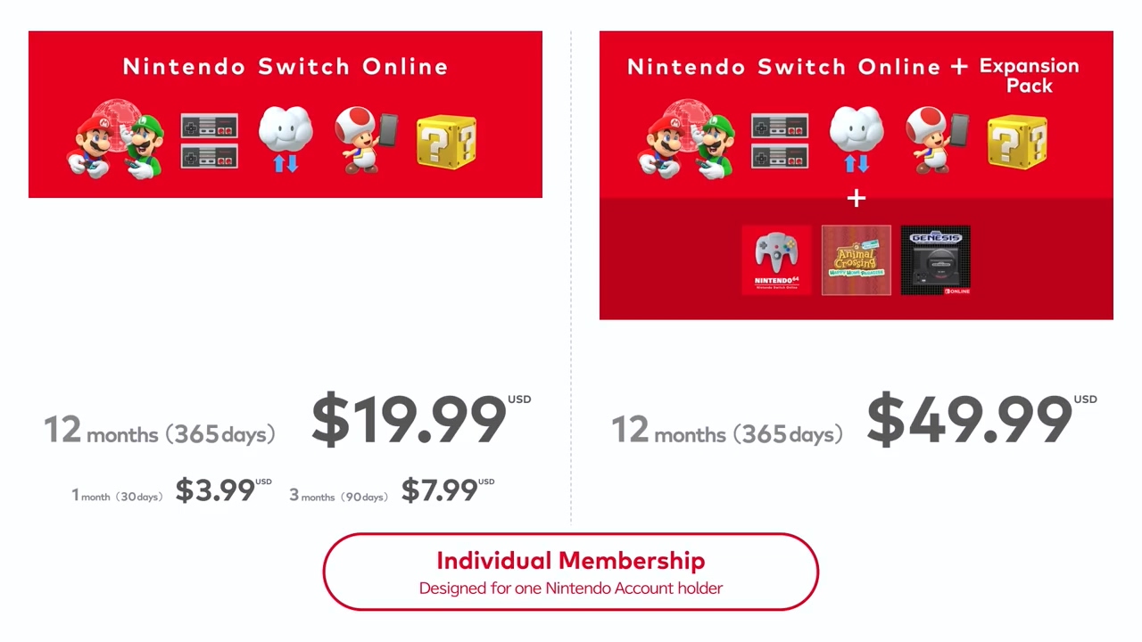 相比较目前标准 Switch 定价,这个 Nintendo Switch Online + Expansion Pack 的定价显然有了明显的提升。目前,个人用户每年费用为 19.99 美元,而家庭用户每年费用为 34.99 美元。