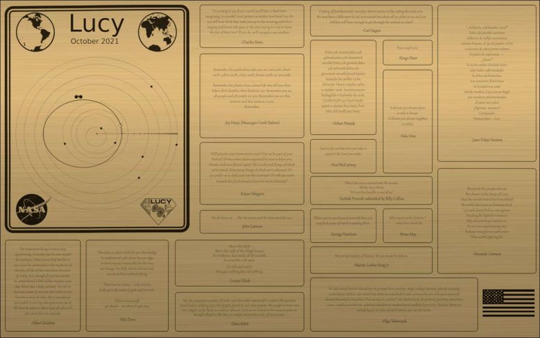 “露西号”以牌匾的形式携带着自己的时间胶囊,上面刻有歌曲作者、作家和诗人的名言和诗句。在其12年的任务结束后,该航天器将继续围绕太阳运行,在地球和特洛伊小行星之间旅行。