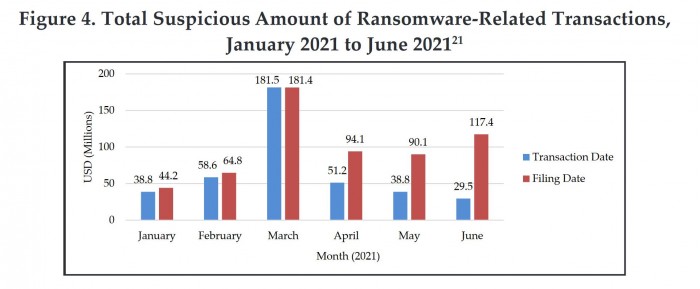 根据周五的报告,该报告基于银行和其他金融机构提交的可疑活动报告的数据,1 月至 6 月期间报告的疑似勒索软件付款总额为 5.9 亿美元。相比之下,2020 年全年报告的疑似付款价值共计 4.16 亿美元。