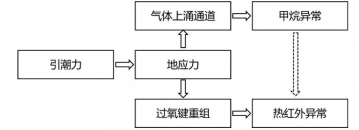 针对于热异常的机理展开了诸多研究,其中包括“应力致热说”、“气热说”、“P-holes 理论”等。研究者针对于汶川地震的热异常和甲烷异常之间的关系展开分析,发现甲烷异常在时间上明显滞后于热异常,其不大可能是导致地震热异常的主要原因,而受引潮力调制的地应力变化则很有可能是造成热异常的直接原因,并给出了热异常、甲烷异常、引潮力和地应力潜在的物理关系,如下图所示。