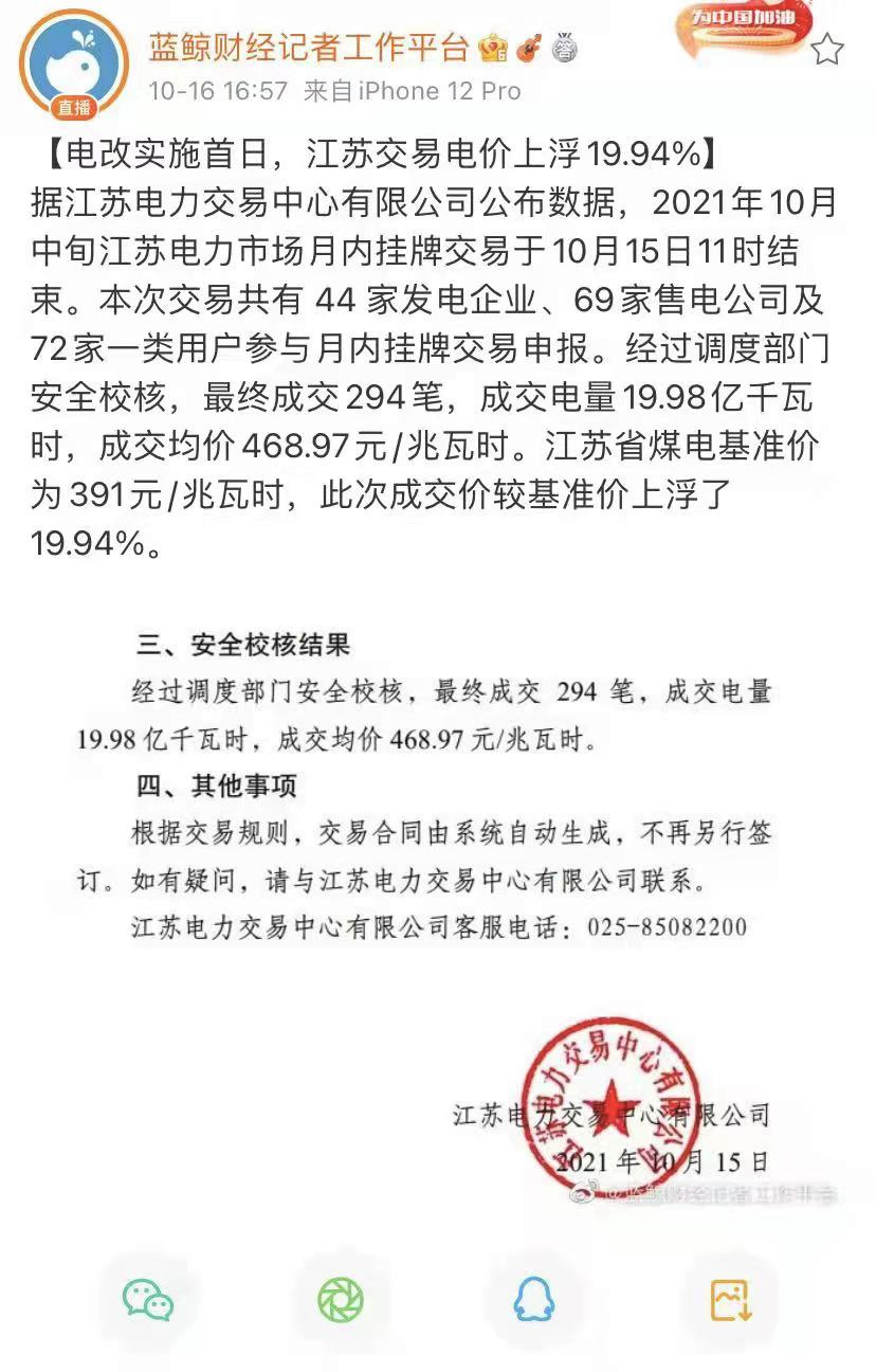 江苏发改委表示,为贯彻落实《通知》要求,疏导燃煤发电企业因煤炭价格大幅上涨带来的成本倒挂、严重亏损情况,缓解企业生产经营压力,切实保障全省电力安全可靠供应,我省及时调整了相关规则和价格上浮20%的幅度(最高价469.2元/兆瓦时),于10月15日组织开展了10月中旬月内挂牌交易。