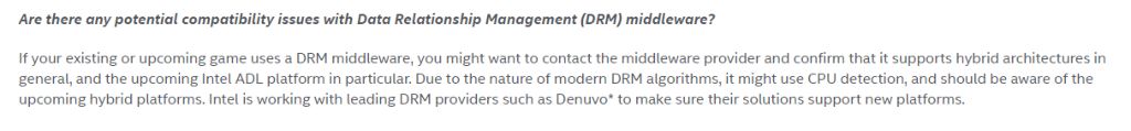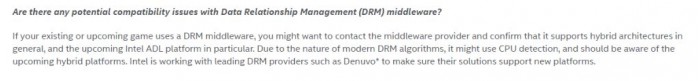 如果你现有的或即将推出的游戏使用 DRM 中间件,你可能想联系中间件供应商,确认它是否支持一般的混合架构,特别是即将推出的英特尔 ADL 平台。