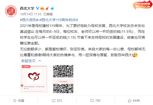 10月14日,西北大学在官方微博发布的一则捐赠倡议引发关注。该校校友总会号召校友、老师及学生每月捐出一杯奶茶或一杯豆浆的钱,支持母校发展。微博文案写道:2021年是母校建校119周年,为了更好地助力母校发展,西北大学校友总会发出真诚倡议:在每月的6--9日,每位校友、老师可以将一杯奶茶的钱(11.9元) 、而在校学生也可以将一杯豆浆的钱(1.19) 节省下来支持母校的发展建设,或者也可捐赠任意金额。