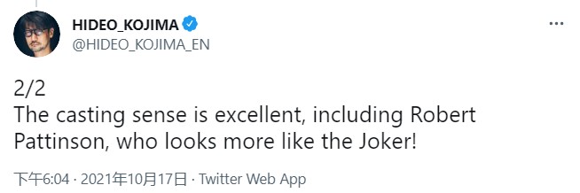 罗伯特·帕丁森主演的《新蝙蝠侠》在近日的DC粉丝节上公布了新预告,著名游戏制作人小岛秀夫在观看之后大赞新的预告片,他表示,新的预告片让我十分兴奋,但是罗伯特·帕丁森在里面看起来更像小丑。