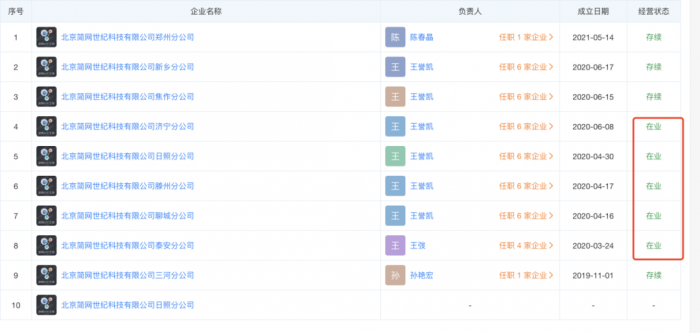 天眼查信息显示,济宁、日照、滕州、聊城、泰安等五个分公司处于在业状态,郑州等其余分公司皆为存续状态。