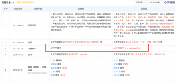 根据天眼查信息,今年1月28日,北京简网世纪科技有限公司注册资本由3000万美元增至8000万美元。今年9月,其经营范围增添了水果蔬菜等食品经营信息。