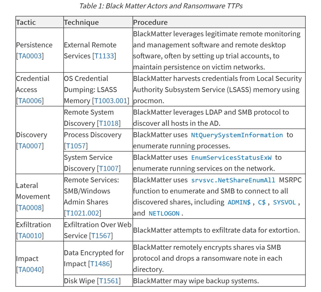 政府机构说,BlackMatter 勒索者要求价值 8 万至 1500 万美元的加密货币,包括比特币和门罗币,以解锁其受害者的系统。BlackMatter 勒索软件开发者以勒索软件即服务(ransomware-as-a-service)的模式运作,他们租赁一些非法责任,并与使用其恶意软件的其他骗子分享利润。