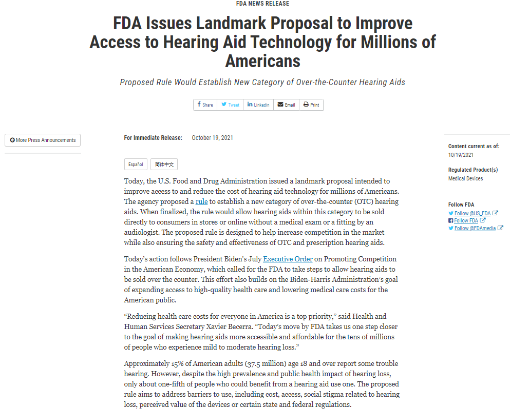 FDA代理局长Janet Woodcock说:“FDA的拟议规则是一个重要步骤,有助于确保轻度至中度听力损失的成年人有更多机会获得更多负担得起的创新产品选择。新的监管类别将为公众在全美范围内的商店或网上购买助听器的决定提供更大的控制权,而不需要进行专业的听力检查、验配调整或处方。”