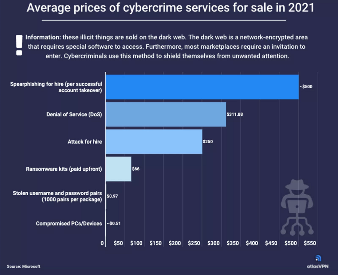根据微软公布的数据,暗网用户可以以低于500美元的价格获得大多数网络犯罪服务。Atlas VPN发现,地下市场提供的单个勒索软件套件的价格低至66美元,而黑客对目标进行长达1个月的持续DDoS攻击,只收取约311美元。