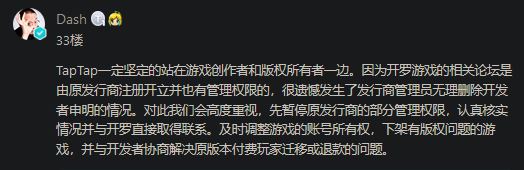 在 TapTap 论坛上多次发布后,该公告多次被删除。TapTap 后于多处表示,删除行为并非 TapTap 官方所为,而是识君通过版主权限删除。同时 TapTap 公司心动网络的 CEO 黄一孟也评论表示:“ TapTap一定坚定的站在游戏创作者和版权所有者一边。因为开罗游戏的相关论坛是由原发行商注册开立并也有管理权限的,很遗憾发生了发行商管理员无理删除开发者申明的情况。对此我们会高度重视,先暂停原发行商的部分管理权限,认真核实情况并与开罗直接取得联系。及时调整游戏的账号所有权,下架有版权问题的游戏,并与开发者协商解决原版本付费玩家迁移或退款的问题。 ”