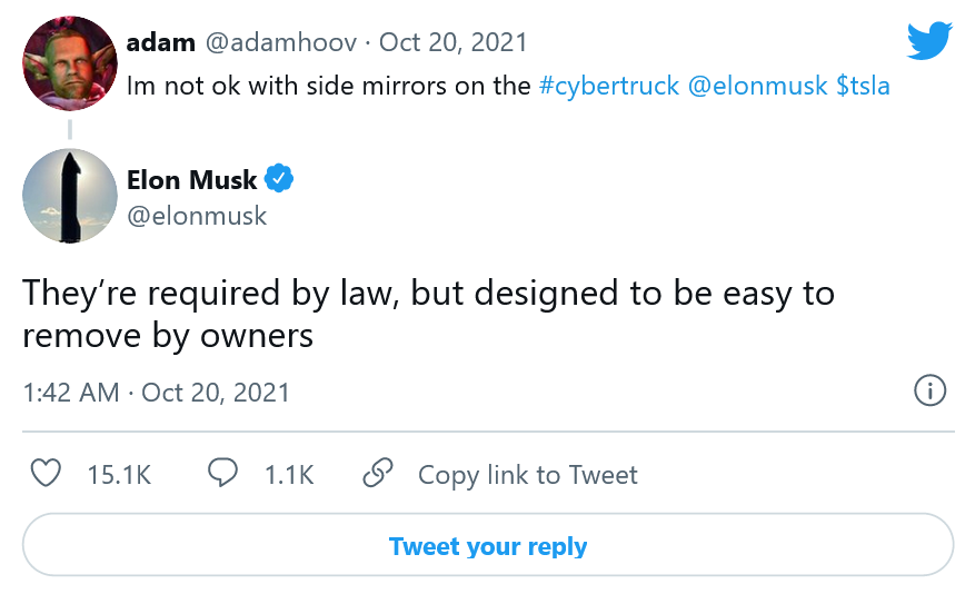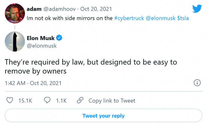 具体而言,马斯克回复了一位Twitter用户,该用户称他们不是后视镜外观的大粉丝。马斯克在回答时说道:“它们是法律规定的,但会被设计成易于车主拆卸。”这位Twitter用户指的是Cybertruck车主论坛上出现的视频,该视频显示这款皮卡上不仅有一套侧后视镜,还有交错的车轮和轮胎以及挡风玻璃雨刷器。每个都是一个小部件,表明该公司仍在努力开发这款车,因此出现了延误。