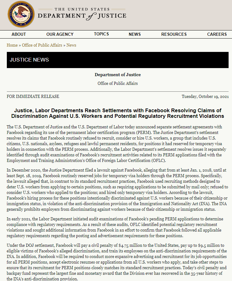 Facebook还与美国劳工部达成了一项单独的协议。在对Facebook的PERM申请--让签证持有人在美国永久工作的计划--进行审计时,劳工部发现了潜在的招聘违规行为,它将进一步调查。
