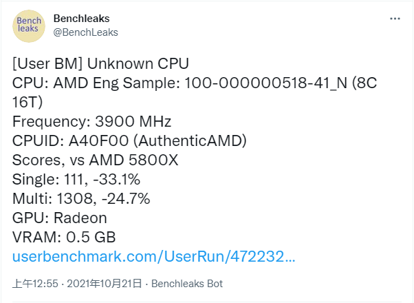 由于是早期样品,猜测它的核心频率还有进一步上调的空间 —— 目前性能略低于锐龙 R9-5900H,单核 111 分 / 多线程 1308 分。