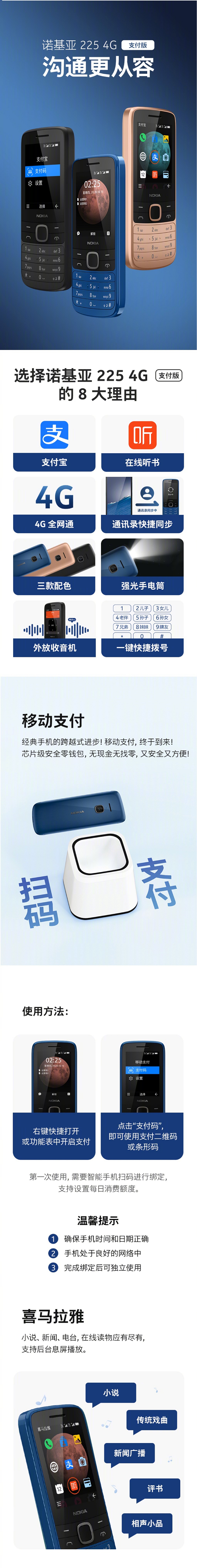 其他方面,诺基亚225 4G支付版免插耳机即可无线外放收音机,内置喜马拉雅App,提供小说、新闻、电台等众多在线读物,可设置8个亲情号码,长按即可快速拨号。