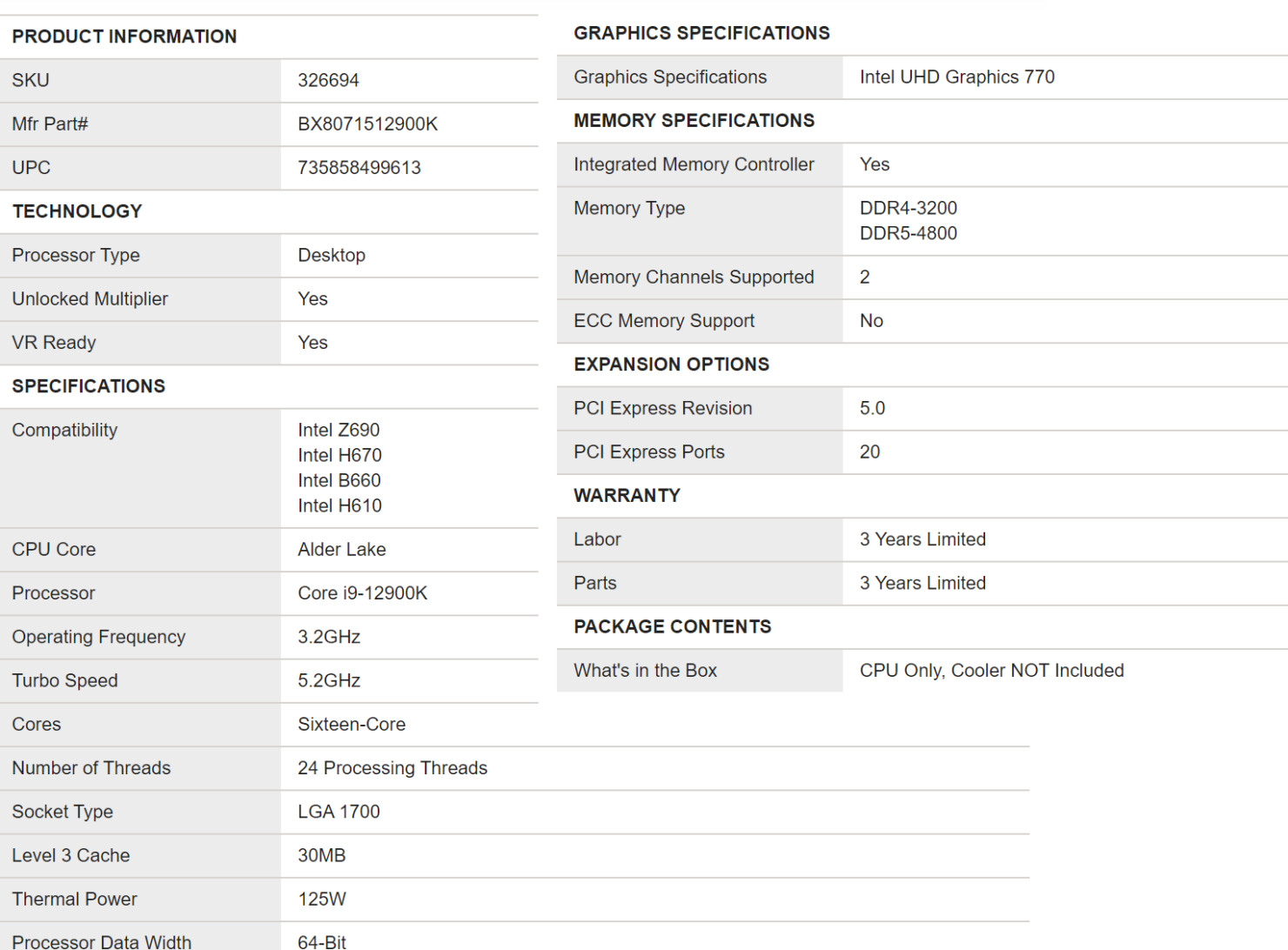 详细规格页面还指出,i9-12900K 拥有 30MB L3 缓存,采用 LGA 1700 主板插槽,PL1 功耗 125W(PL2 可达 228W)。
