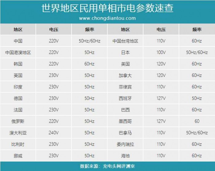 居民单相用电一般在100至240V电压范围,根据交流电的工频频率划分,共有50Hz、60Hz两种,充电器基本都做到了兼容两种频率。通过上图参数速查表格可以看到,从电压上来看,主要可以分为220V、110V两种电压体系。