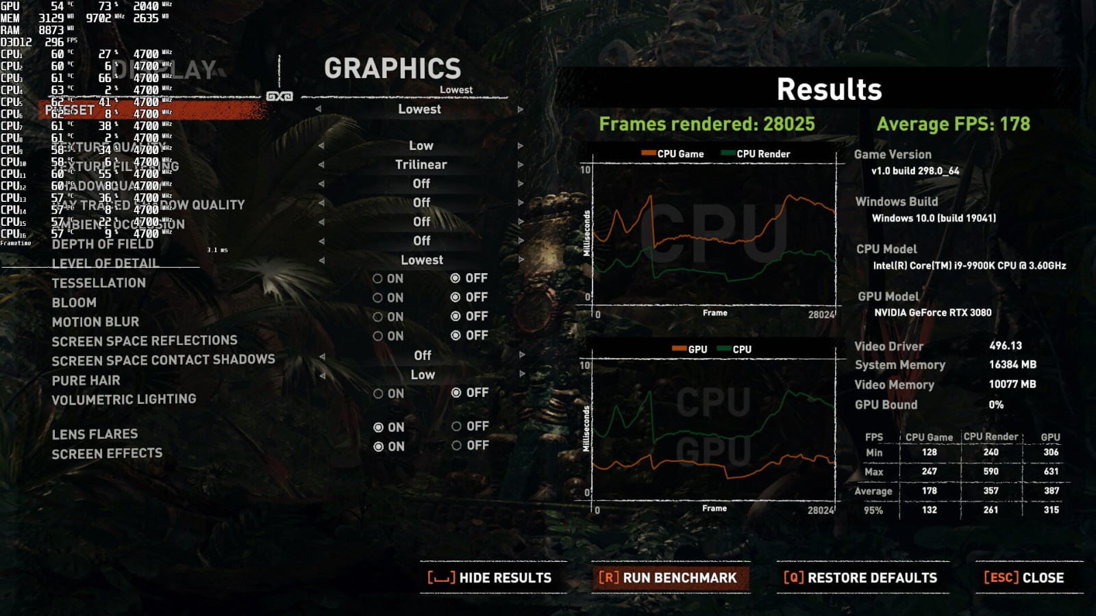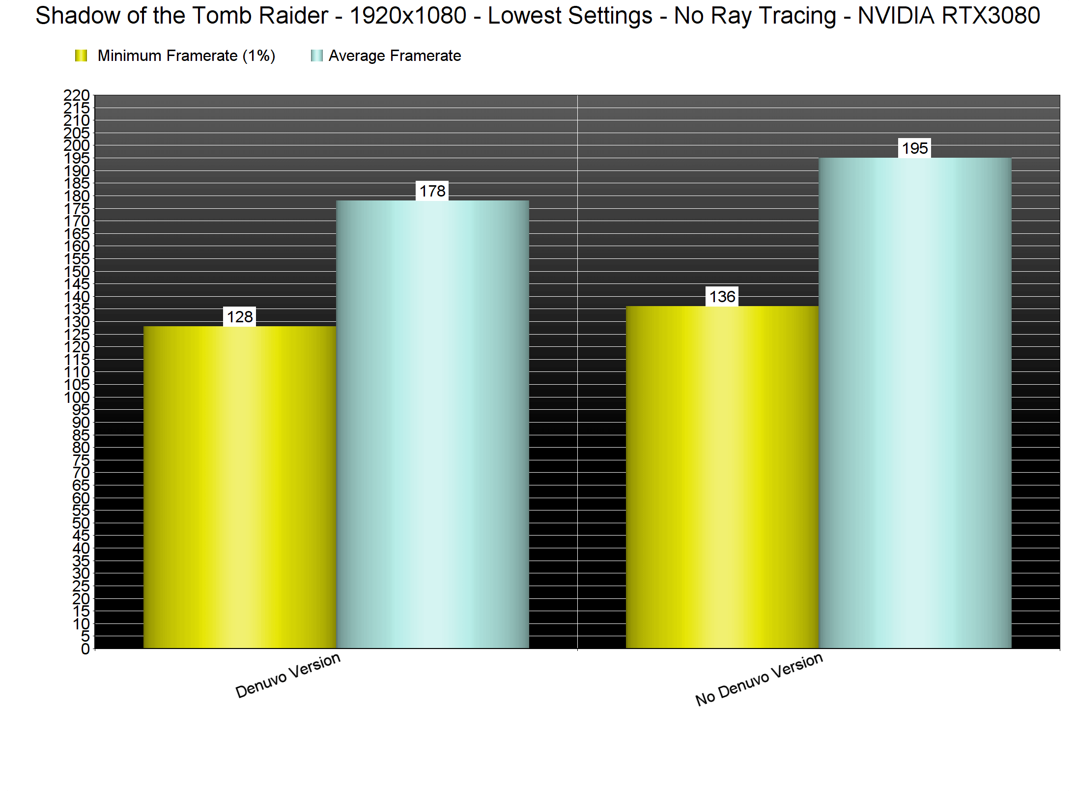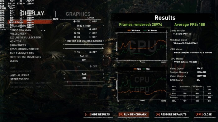 玩家都知道,D加密会给电脑的CPU造成很大压力,所以我们对最有可能导致CPU瓶颈的场景进行测试。我们的测试是在1080p/最高画质设定下(没有光追和DLSS)和1080p/最低画质设定下进行的。