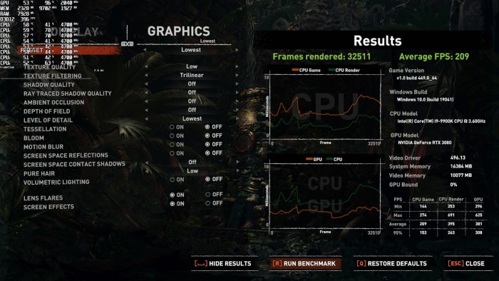 史克威尔艾尼克斯和Crystal Dynamics称最新版升级档中加入了最新的NVIDIA DLSS,使用光追阴影来优化光追降噪,使用Epic网络服务器优化多人游戏架构,修复Intel显卡兼容性问题。所以我们没有使用DLSS和光追。除了这些优化之外,该补丁并没有对CPU和内存进行优化(至少开发者是这么说的)。