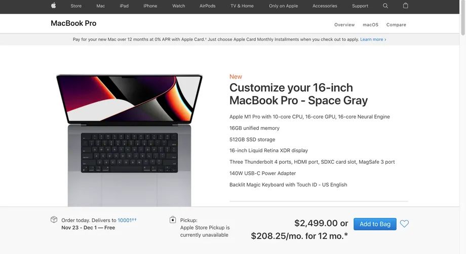 苹果美国官网显示 14/16 英寸新款 MacBook Pro 的交付日期已经延迟到 11 月底/12 月初了。在美国当地时间周日上午,14 英寸 MacBook Pro 基础款的预估交付日期为 11 月 16-23 日,而 14 英寸定制款 MacBook Pro 预估交付时间将推迟到 12 月中旬。 对于 16 英寸 MacBook Pro,标准配置的估计发货时间在 11 月 23 日和 12 月 1 日之间,定制选项也显示 12 月中旬的发货日期。