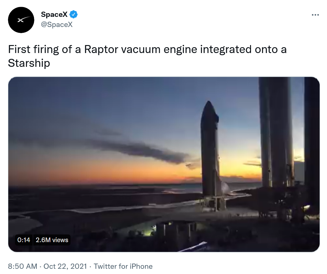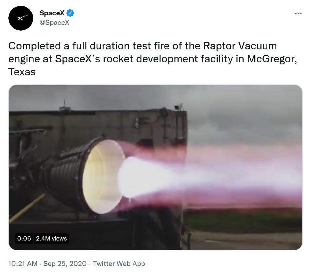 在周末进行的测试中,这些真空Raptor发动机之一被整合到Starship中并首次成功试射。