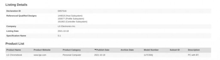 科技媒体 Chrome Unboxed 报道称,在一份蓝牙 SIG 文件中提到了“LG Chromebook”。不幸的是,这就是目前所有的信息,只是确认会有这样一款设备,但是关于该设备的其他信息都不知道。