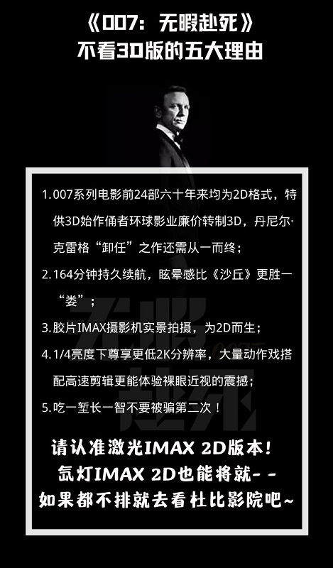 今天(10月26日)一早,便有网友在微博发图,呼吁广大影迷自发抵制即将在国内上映的《007》系列新作《007:无暇赴死》的3D版本,并获得了一致赞同。图中提到,在拍摄技法上,《007》系列的24部作品均为2D格式,且《无暇赴死》在拍摄全程都使用了胶片IMAX摄影机进行拍摄,本身在技术上就更为适合2D。
