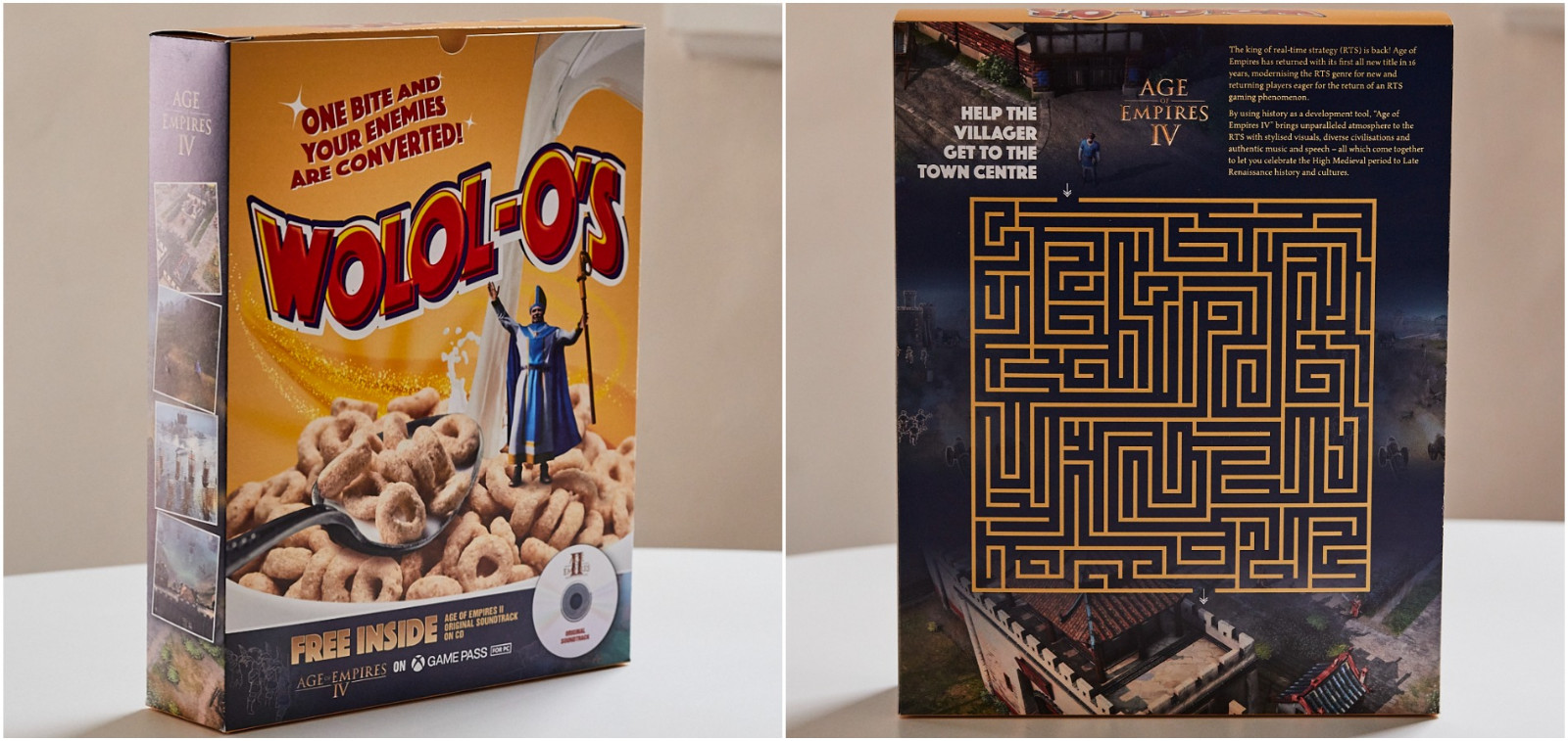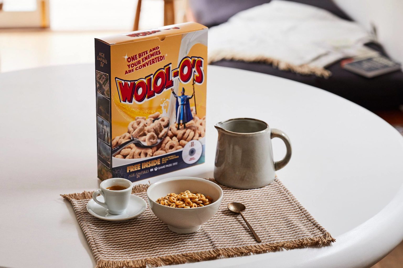 OnMSFT 指出,Xbox 的澳大利亚与新西兰分公司,已经制作了一款受该电子游戏启发的实物产品。为了庆祝本周的《帝国时代 IV》发布,Xbox 官方刚刚分享了一款特色周边,它就是附赠了免费 CD 的“Wolol-o”早餐谷物食品。