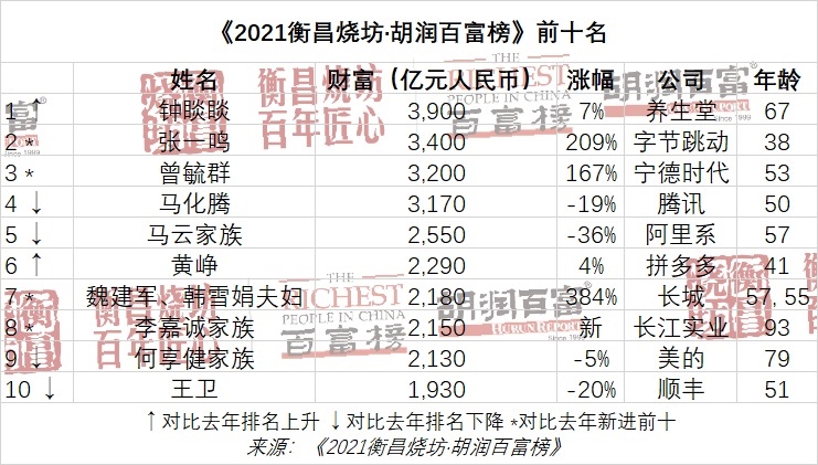 需要注意的是,此次榜单相较于去年带来了较大的变动,首先是蝉联了4年首富宝座的马云大跌,被农夫山泉67岁的钟睒睒反超而上,以3900亿元首次成为中国首富,其财富比去年增长250亿。