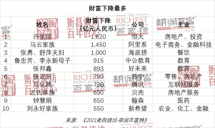 在2017年曾站上首富宝座的恒大许家印,则是此次百富榜上最受关注的一位,其财富比去年下降1620亿,是今年榜单上财富下降最多的企业家,以730亿从去年的第五位跌至第70位。