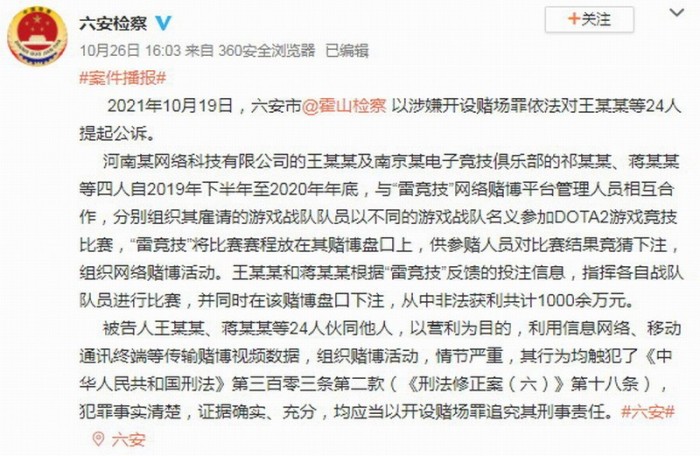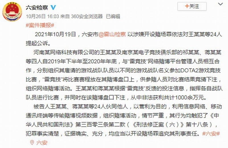 近日六安检察官方微博发文称,2021年10月19日六安市霍山检察,以涉嫌开设赌场罪依法对王某某等24人提起公诉。