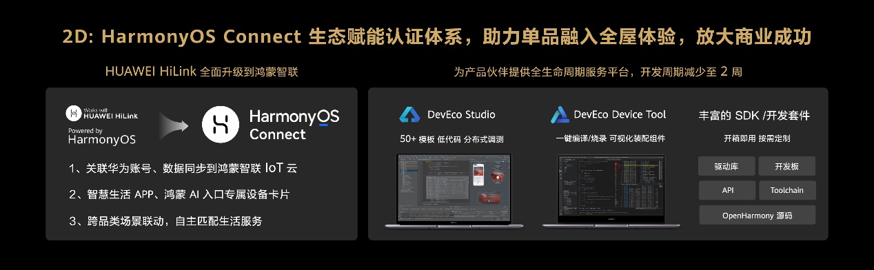 可以看到,“2D使能”代表着华为方面能为产品伙伴提供全生命周期服务平台,开发周期由此将缩短至两周的时间。而 HarmonyOS Connect生态赋能认证体系则能帮助某一智能单品能加速融入全屋体验,从而进一步放大商业成功。