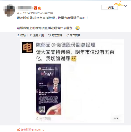 今日上交所对诺德股份副总经理陈郁弼予以监管警示。根据之前相关报道,此事来源于诺德股份副总经理陈郁弼的一份朋友圈截图,日前有网友曝光陈郁弼的朋友圈发文,显示他曾表示:“请大家支持诺德,明年市值没有五百亿,我切腹谢罪。”同时,还配发其本人在某产业链峰会上的个人演讲海报。