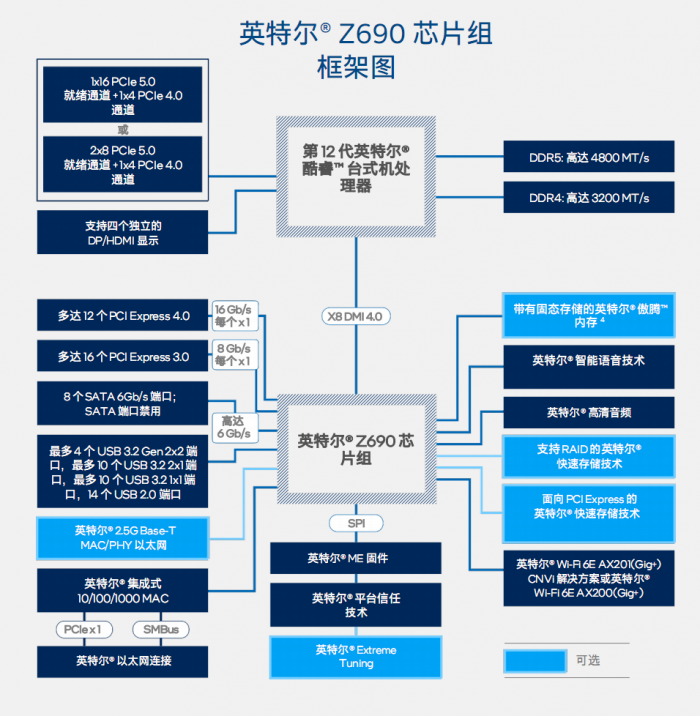 Alder Lake 12代酷睿处理器发布的同时,因为封装接口的变化,以及DDR5、PCIe 5.0的加入,Intel也推出了新的主板芯片组“Z690”。Intel Z690芯片组拥有丰富的扩展连接性,尤其是在Intel主板上首次支持PCIe 4.0(也是继AMD X570之后的第二款),最多可提供12条通道,同时还有16条PCIe 3.0,搭配12代酷睿一共可提供16条PCIe 5.0、16条PCIe 4.0、16条PCIe 3.0,前所未有的慷慨。