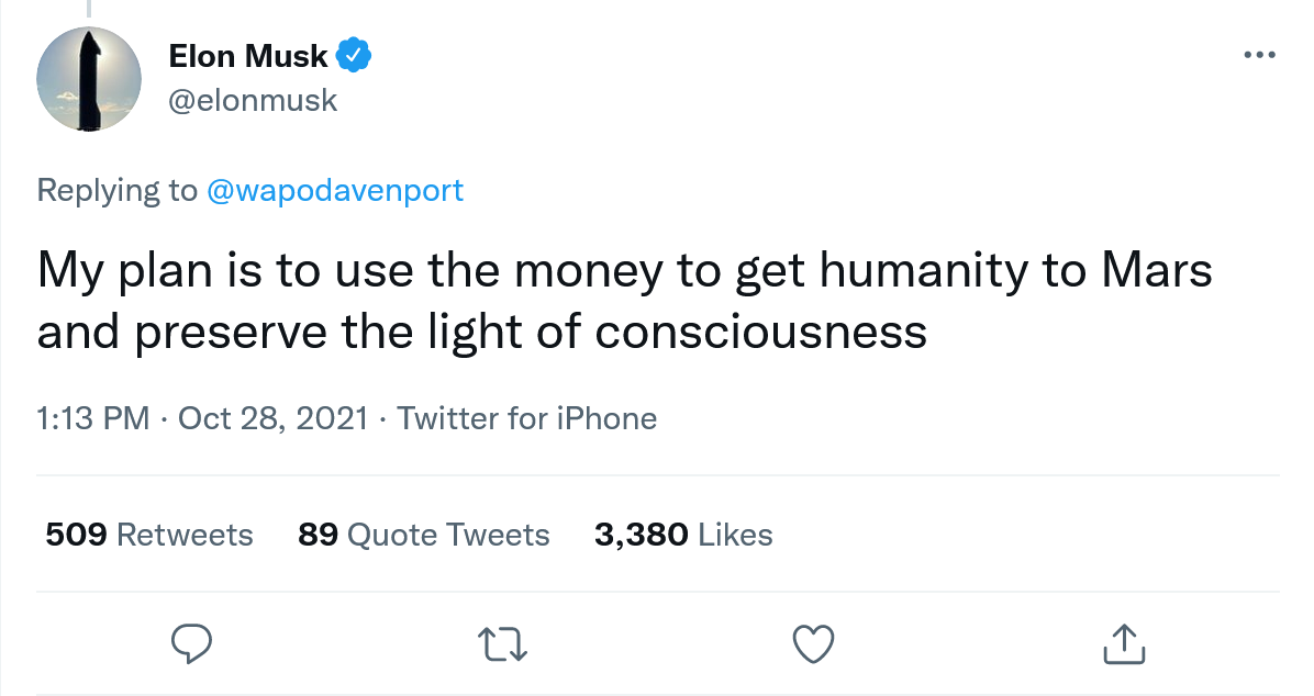 有媒体指出,这笔钱已足够支付一次火星任务。对此,马斯克周四发推称:“我的计划是用这笔钱将人类送上火星,并保护意识之光。”