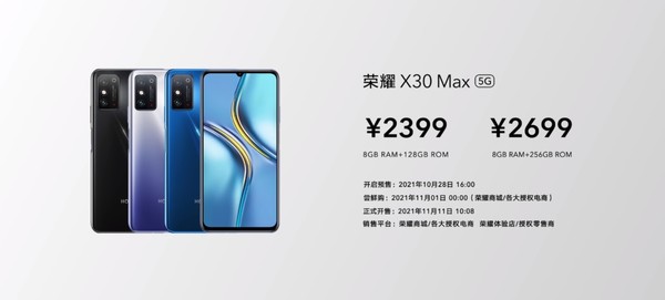 10月28日下午,定位“5G大屏,超长续航”的荣耀X30 Max正式发布,有幻夜黑、魅海蓝、钛空银三种配色可选,提供了8GB+128GB、8GB+256GB两种内存版本可选,分别售价2399元、2699元,将于今天下午4点开启预售。