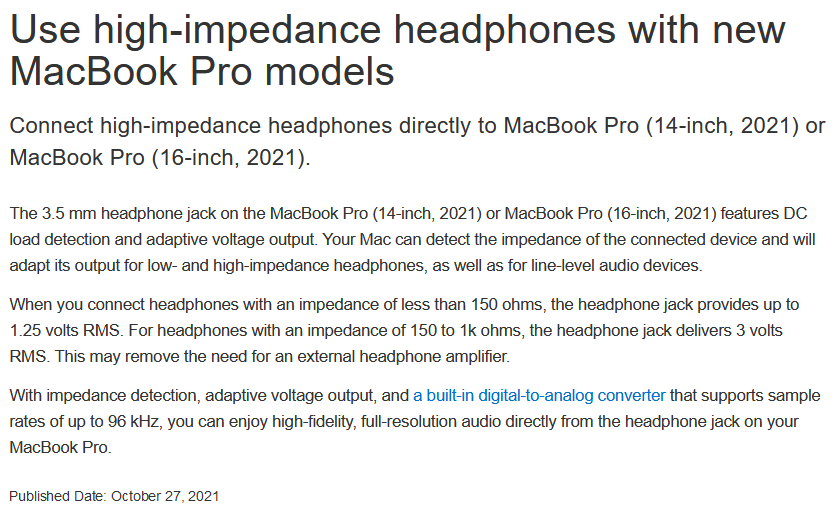 "新的MacBook Pro机型支持使用高阻抗耳机,"这是一份关于改进的新支持文件中描述的。"当你连接阻抗小于150欧姆的耳机时,耳机插孔提供高达1.25伏的有效值,但对于阻抗为150至1k欧姆的耳机,耳机插孔提供3伏有效值,这可能消除了对外部耳机放大器的需求"。