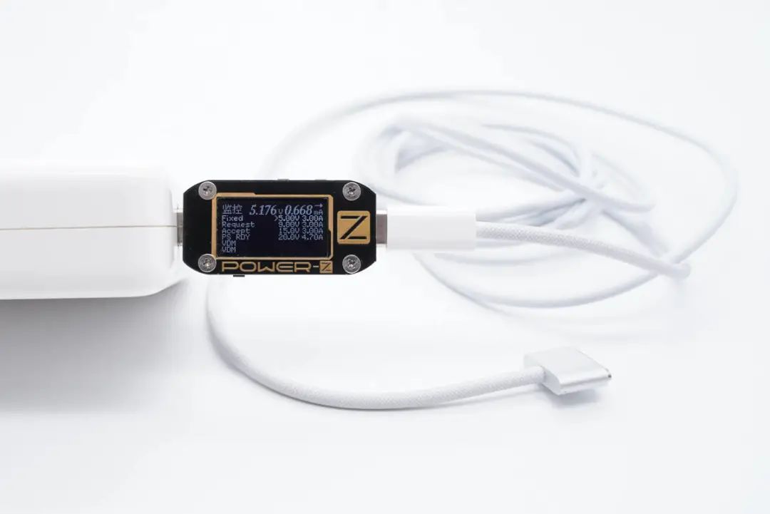 一般常见的100W USB-C to USB-C快充线,内部都会加入E-Marker芯片,提升安全性。E-Marker芯片可以记录线缆的功率、数据传输能力以及线缆长度等基本信息。充电头网使用ChargerLAB POWER-Z KM001C测试苹果这条线,未检测到相关E-Marker信息。