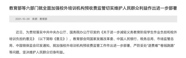 据教育部网站消息,近日,为贯彻落实中共中央办公厅、国务院办公厅印发的《关于进一步减轻义务教育阶段学生作业负担和校外培训负担的意见》(以下简称《意见》),教育部会同国家发展改革委、中国人民银行、税务总局、市场监管总局、中国银保监会印发通知,就加强校外培训机构预收费监管工作作出进一步部署,严防妥处“退费难”“卷钱跑路”等问题,坚决维护人民群众切身利益。