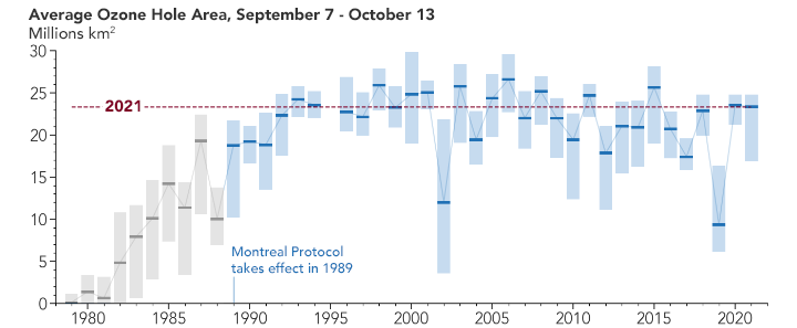 虽然2021年的南极臭氧洞比平均水平大,但它大大小于20世纪90年代末和21世纪初的臭氧洞。上图显示了自1979年以来每年臭氧洞的平均大小(蓝色和灰色实线),以及其大小范围(浅蓝色和灰色阴影条)。