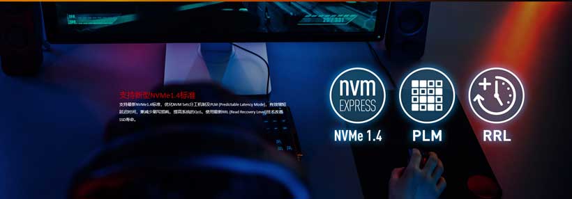 A440 PRO支持最新的NVMe 1.4标准,兼容PCIe 3.0和PCIe 4.0标准,并使用最新的RRL(读取恢复级别)技术来提高SSD的使用寿命。其优化的NVM Sets分段机制和PLM(可预测延迟模式)有效地减少了延迟和读/写磨损,提高了系统的QoS(服务质量),确保A440 PRO SSD的峰值性能,并满足玩家对终极存储体验的巨大期望。