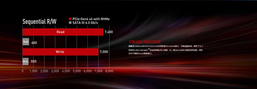 CARDEA A440 PRO SSD 搭载全新升级特殊铝鳍散热片,特殊导流设计有效降温48%,相比于其他 SSD 更能推迟因高温而导致掉速的问题,提供更稳定的读写效能。