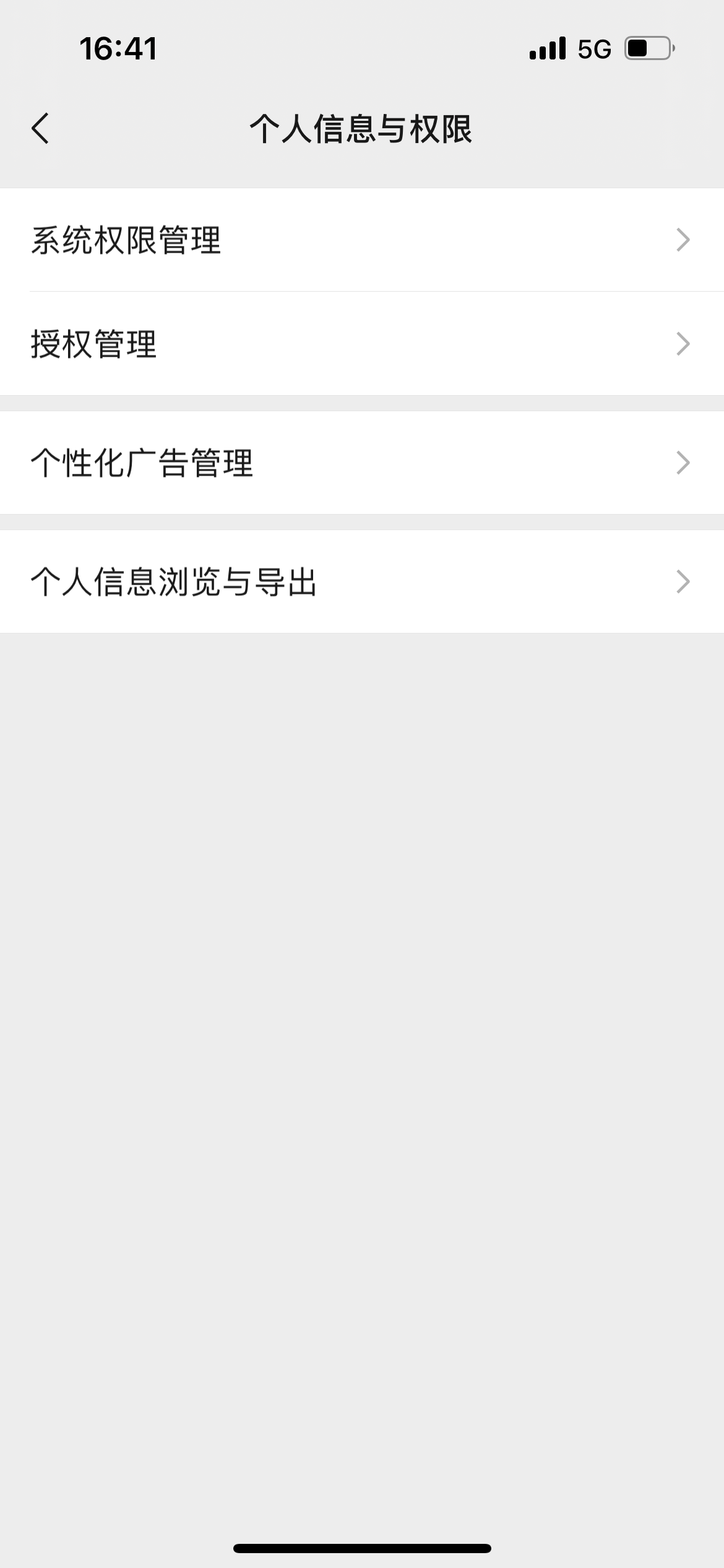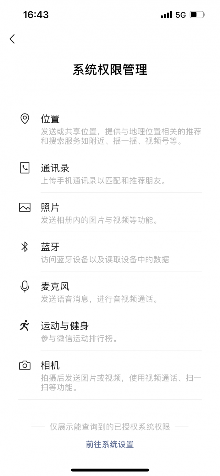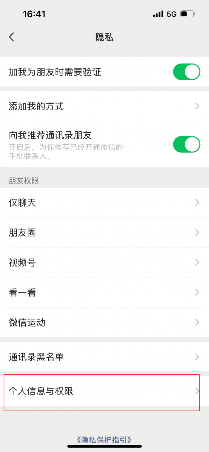 微信iOS 8.0.16中,在设置-隐私-新增“个人信息与权限”选项,可以查看管理系统权限(包括地理位置/相机/照片等)、授权App、关闭个性化广告等。
