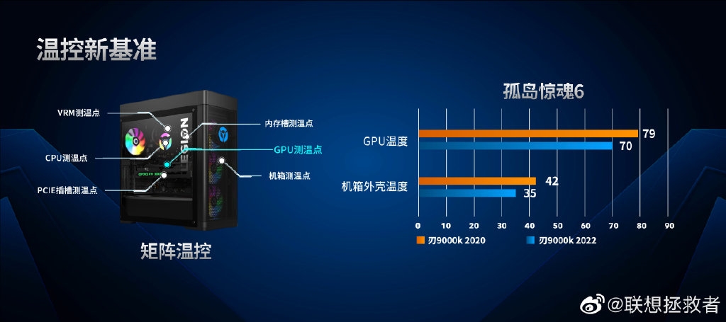 根据联想公布的温度实测结果,刃9000K 2022游戏主机在《孤岛惊魂6》游戏中机箱外壳温度不超过35度,GPU显卡温度70度,比上代产品低了7度、9度,降温明显。