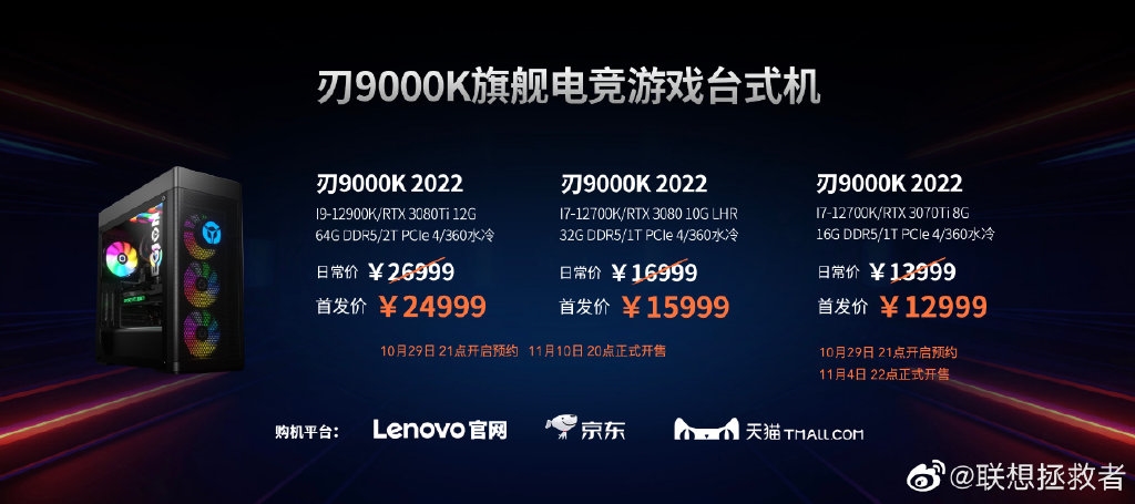 售价方面,酷睿i9-12900K+64GB内存+RTX 3080 Ti版售价26999元,首发优惠价24999元,酷睿i7-12700K+32GB内存+RTX 3080版售价16999元,首发优惠价15999元,酷睿i7-12700K+16GB内存+RTX 3070 Ti版售价13999元,首发优惠价12999元。