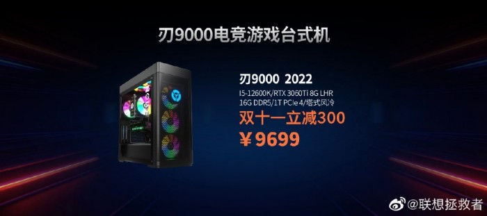 此外还有刃9000 2022版,酷睿i5-12600K+16GB内存+RTX 3060 Ti版售价10999元,首发价9999元,双11优惠300元,到手9699元。